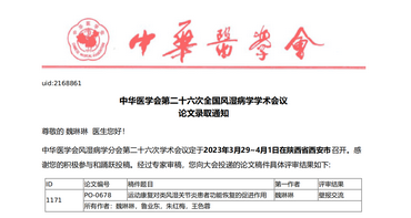 我院魏琳琳、魯業(yè)東、王色蓉主任聯(lián)合撰寫的論文《運(yùn)動(dòng)康復(fù)對(duì)類風(fēng)濕關(guān)節(jié)炎患者功能恢復(fù)的促進(jìn)作用》中華醫(yī)學(xué)會(huì)第二十六次全國風(fēng)濕病學(xué)學(xué)術(shù)會(huì)議收錄。